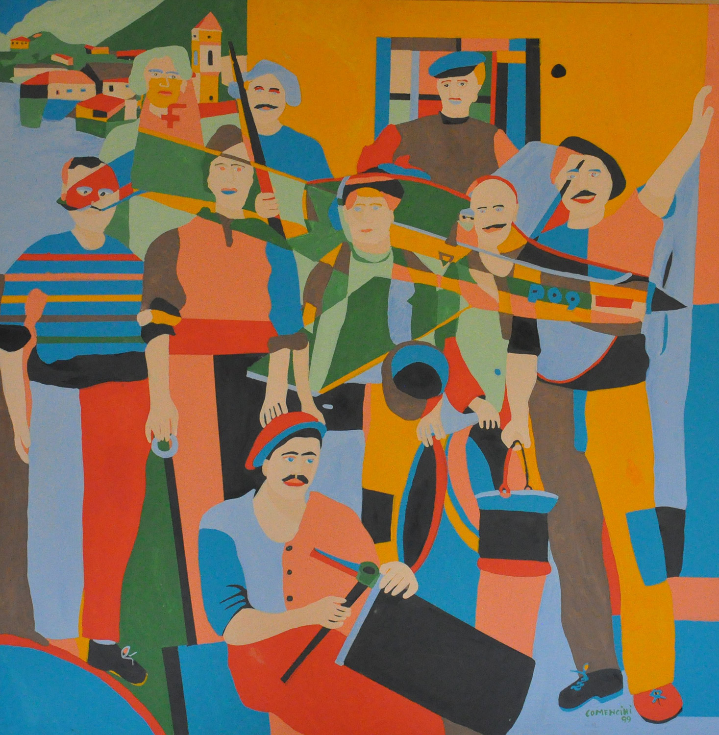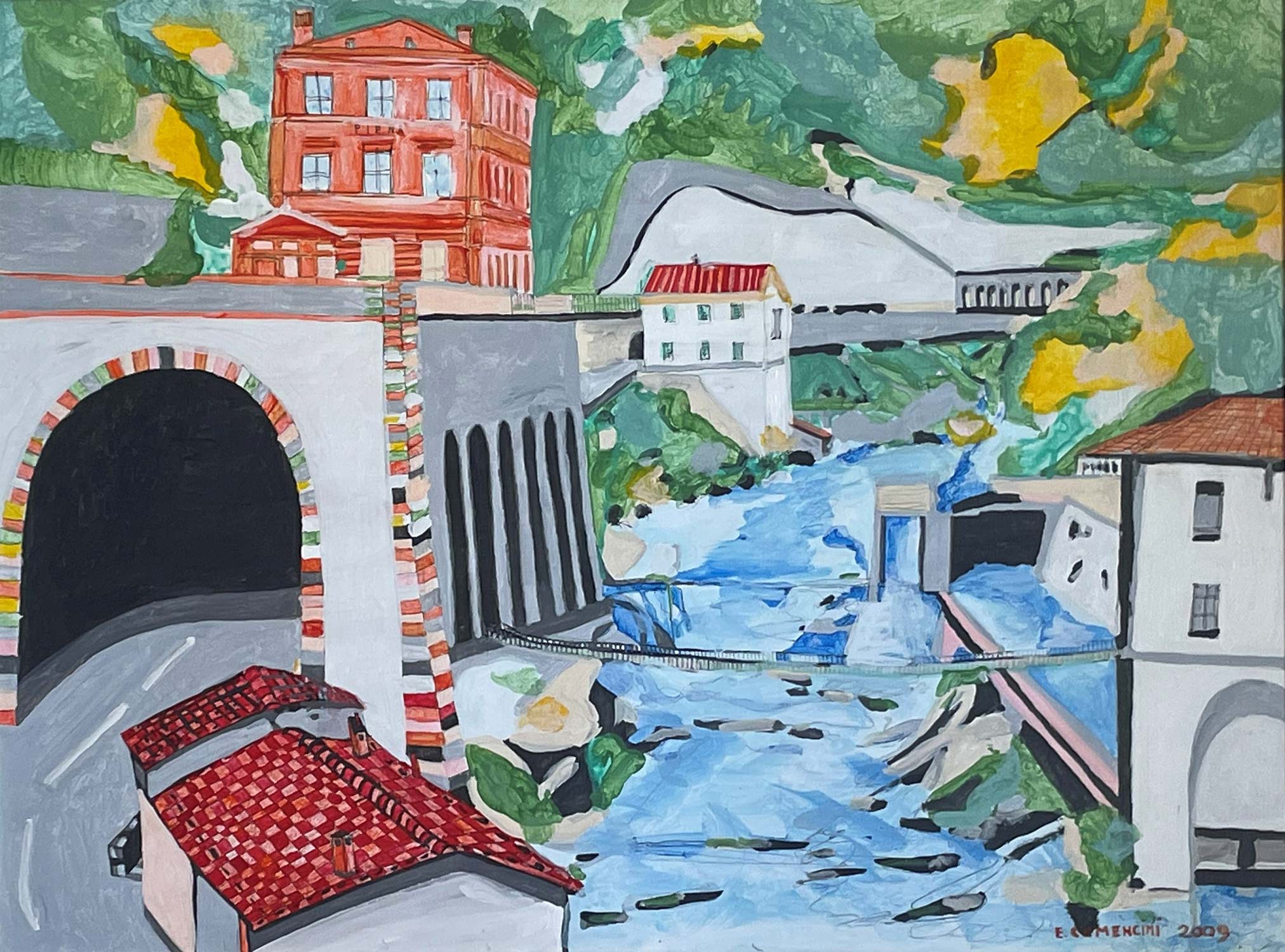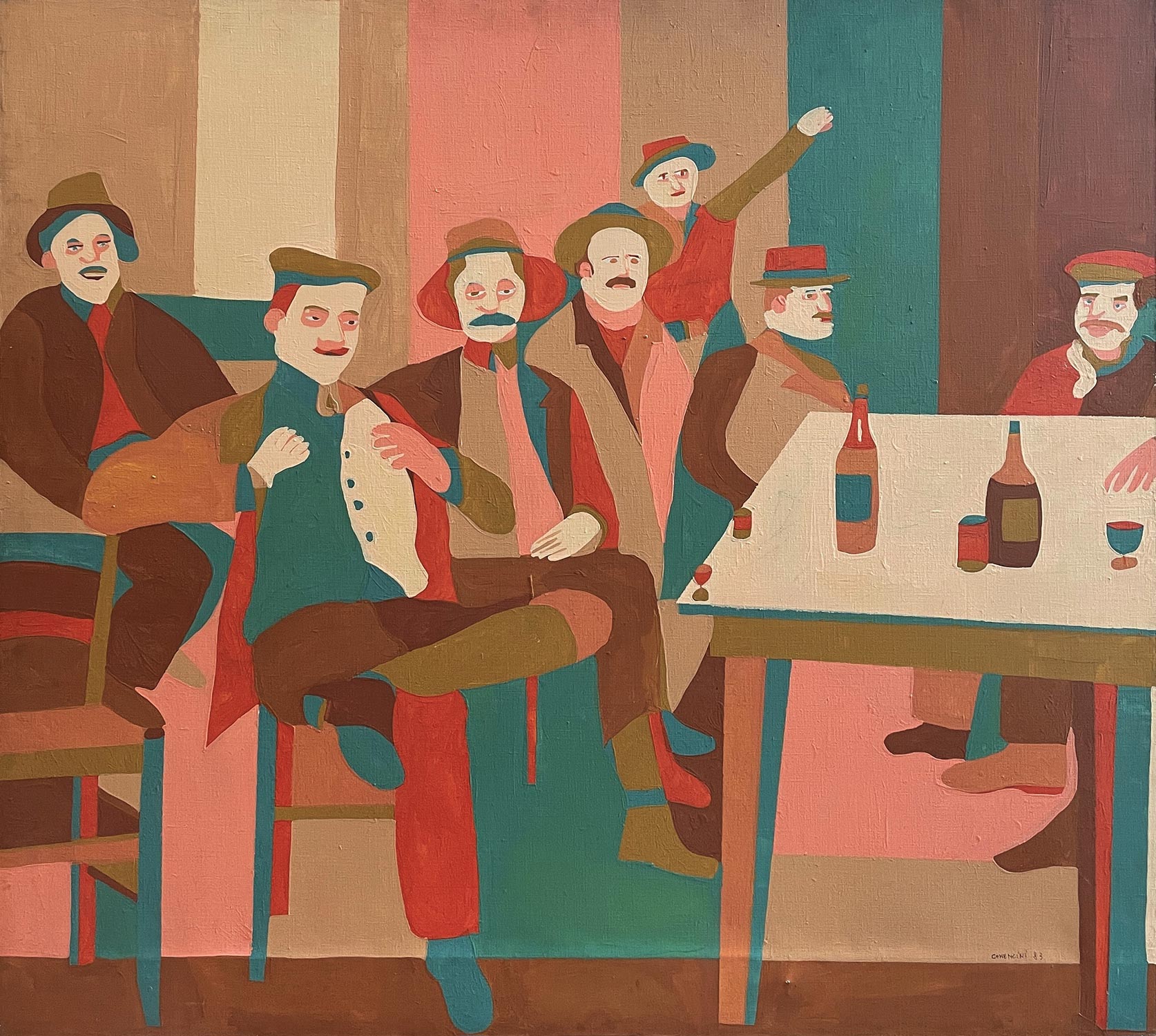 Infatti, la casa della madre, la stazione ferroviaria, le tavolate all’osteria le ritroviamo nei suoi quadri così come sono proprio i personaggi che qui incontra, gendarmi e doganieri con le loro divise, contadini o viandanti e che vede al bar intenti a sorbire, senza fretta, in allegria, qualche buon bicchiere di vino, che lasciano una impronta profonda nella memoria di Genio e di cui troviamo traccia nella sua pittura.